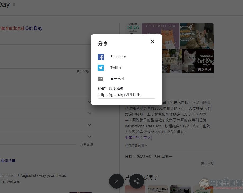 Google 搜尋結果頁面下方還有兩個功能,一個是分享功能能讓你分享頁面。
