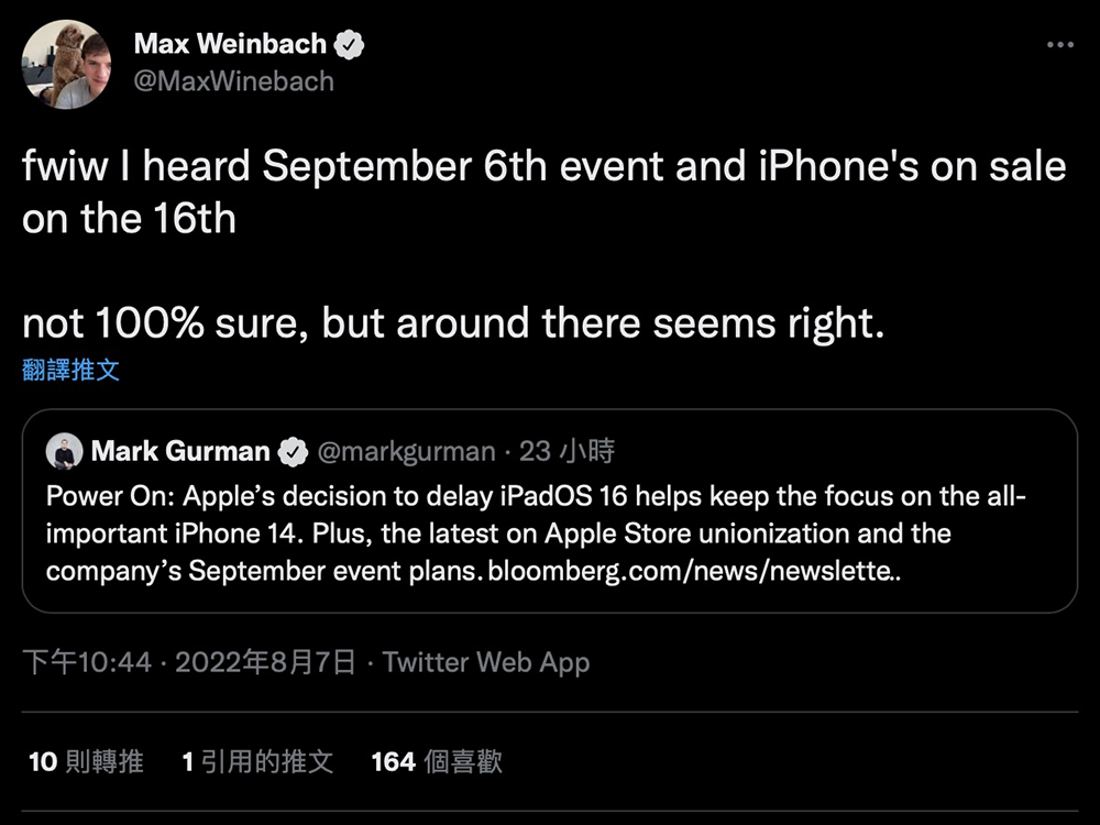 過去我們分享過許多關於 iPhone 14 系列的新機規格爆料資訊,如果已經打算在今年發表後購入新 iPhone ,那麼 iPhone 14 系列何時會發表相信是大家關心的重點。前段時間,根據 Max Weinbach 在 Twitter 得到的消息, iPhone 14 系列可望在 9 月 6 日發表,並於 9 月 16 日正式開賣。雖然這消息還不是 100% 肯定,但可預期 Apple 秋季發表會的時間會落在 9 月上旬。