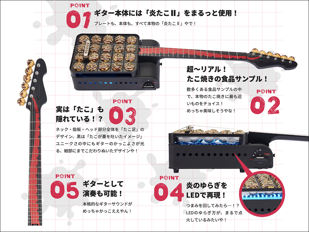 根據 Iwatani 官網的商品描述,這款雙方聯合打造的「章魚燒電吉他」使用 Iwatani 的章魚燒機的造型為設計靈感,從爐台、煎盤都參照「炎章魚II」的造型打造。章魚燒電吉他不是將章魚燒機直接裝上電吉他的指板、琴頭、琴橋和琴弦這麼簡單,也當然不能用來製作美味的章魚燒。各位看到的藍色火焰部分,其實是 LED 燈的效果。