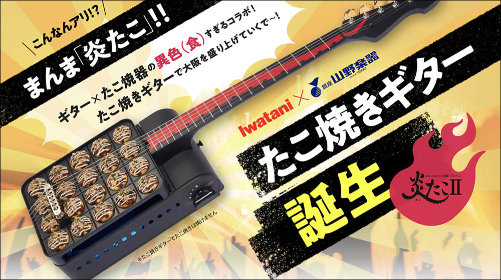 來自日本的山野樂器(Yamano Music)成立於西元 1892 年,今年迎來創業 130 周年,過去經手無數的樂器、也提供義大利手工提琴的訂購服務,但這老牌百年樂器公司在幾年前開始不時會推出些令人意外的創意吉他。最近,山野樂器與岩谷(Iwatani)聯手推出一款結合章魚燒機和電吉他的「章魚燒電吉他」。