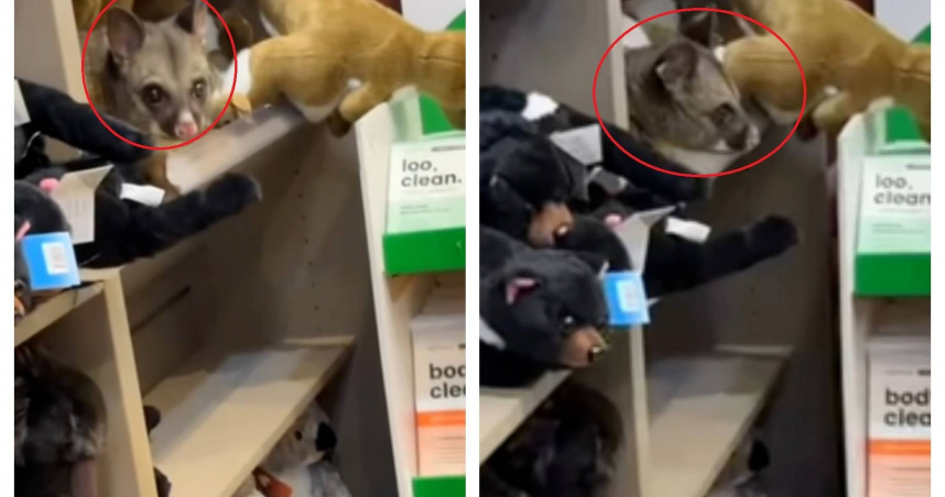 這隻會動!野生負鼠現身機場商店 混進娃娃區顧客嚇一跳