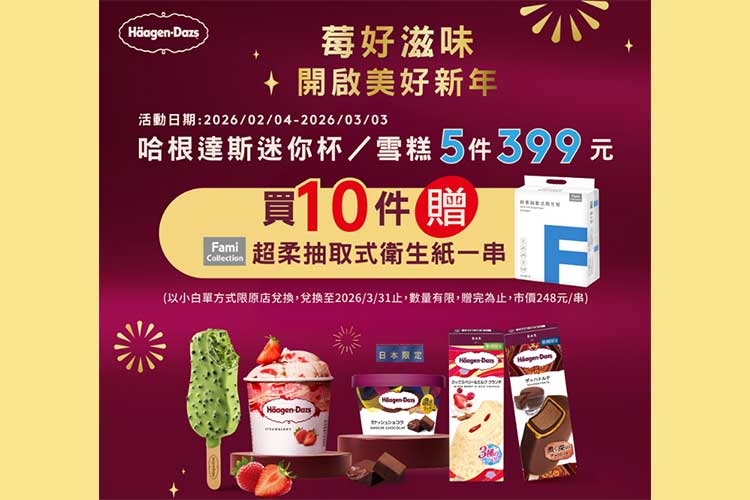 即日起至2026/3/3(二),至全家便利商店購買哈根達斯迷你杯/雪糕,任選5件只要$399;買10件再送FamiCollection超柔抽取式衛生紙1串。原文出處全家便利商店x哈根達斯 買冰加送1串衛生紙延伸閱讀2026 國民神卡首選!國泰世華CUBE信用卡最新權益切換、領券加碼省錢攻略滙豐信用卡首刷開箱》TRAVEL FOX旅狐28吋爵士旅人上掀式前開拉鍊行李箱