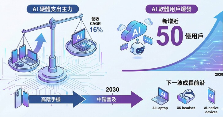 AI硬體初期佔據優勢,但消費端AI軟體潛力更顯著。報告預測AI聊天機器人用戶將爆發性增長,AI硬體與AI軟體共同推動科技產業發展。根據市調機構 Counterpoint Research 於 2025 年 11 月 23 日發布的最新報告《Global AI Consumer Spends Forecast, 2024–2030》,生成式 AI 技術的應用正在改變全球科技產業的發展方向。該報...