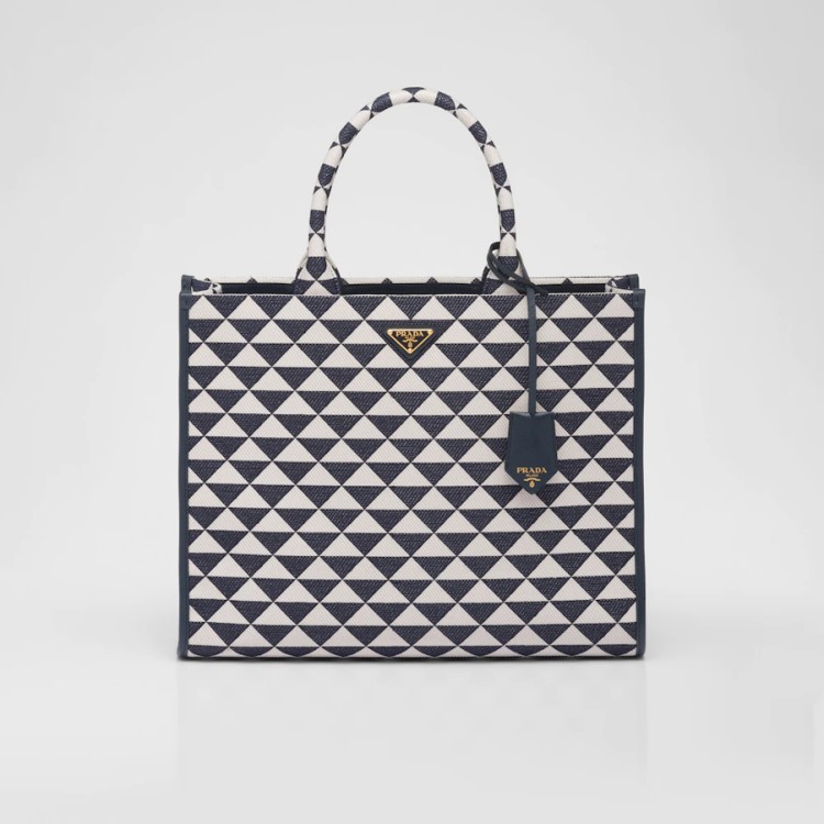 三角鐵牌是 Prada 最經典的 Logo,在近期品牌用 “圖像記憶法” 將大量的三角形運用在各個單品中,除了將其符號化身為品牌的廓形外,這款托特包巧妙的用繁複的重複圖紋呈現,讓這款包以幾何印花的外型讓人過目難忘。(商品售價:NTD100,000)