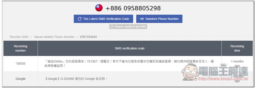 Receive Sms Online 也是一個專門提供各國免費門號的網站,台灣有兩個,另外還有美國、家拿到、香港、中國、巴西等等。這網站沒有提供一鍵複製門號功能,因此需要手動選取複製。而點擊 RECEIVE SMS,即可閱讀這門號收到的簡訊。