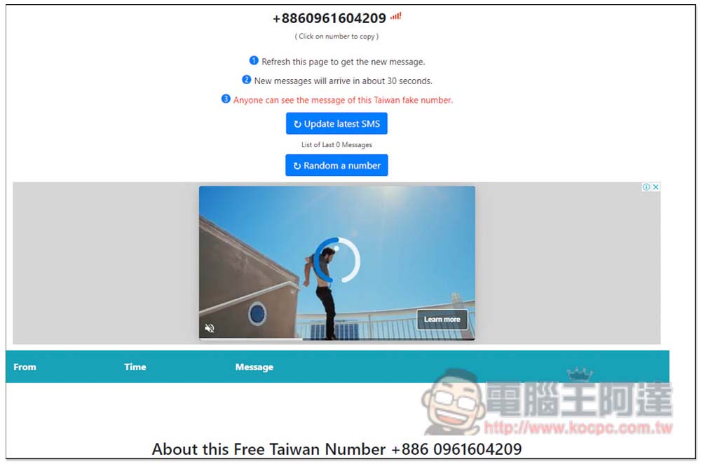 不知道是剛更新門號,還是很少人使用,我查目前兩個台灣門號都沒人使用過(沒有任何簡訊),內頁會告訴你 30 秒鐘內有沒有收到簡訊,點擊 Update Latest SMS 可以重整頁面。