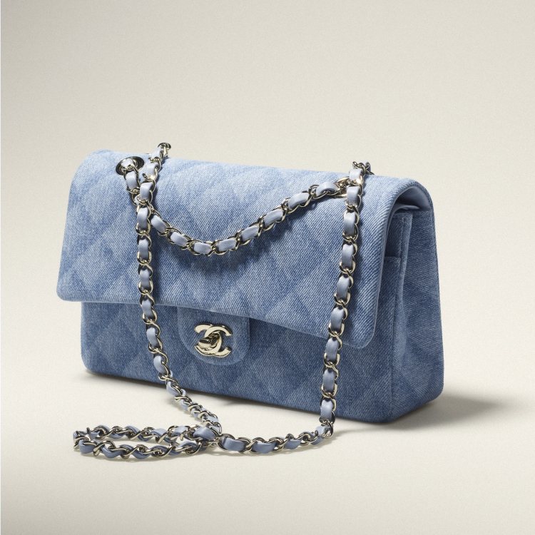 Chanel 用過不少牛仔丹寧面料來呈現 11.12 包款,但在過去,品牌大多以衍縫的方式呈現,但在這次 Chanel 用了像是水洗的印刷方式來演繹包款,其細緻的漸層紋理,讓菱格紋元素以極為立體的方式呈現,不仔細看完全不會發現其包款上的格紋是以印花的方式製作。