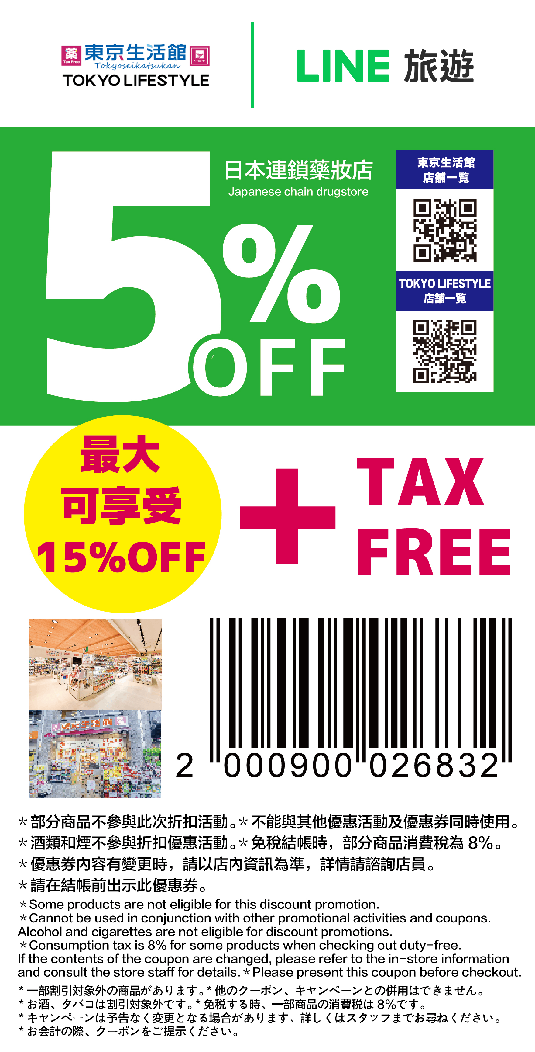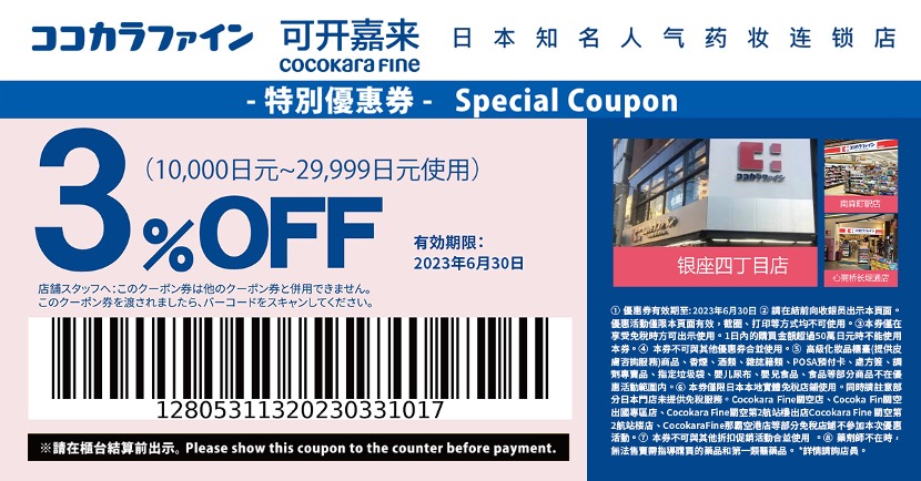 在關東、關西相當密集的藥妝店COCOKARA FINE以「為顧客及患者提供保健美容的專業建議」為主要訴求,提供專業知識與諮詢服務的日本藥妝店,提供顧客豐富的商品選擇。現在在日本COCOKARA FINE結帳出示與LINE旅遊合作的優惠券,就可以享有消費3萬日元以上未滿5萬日元可以獲得5%折扣優惠,消費5萬日元以上可以獲得7%折扣優惠。