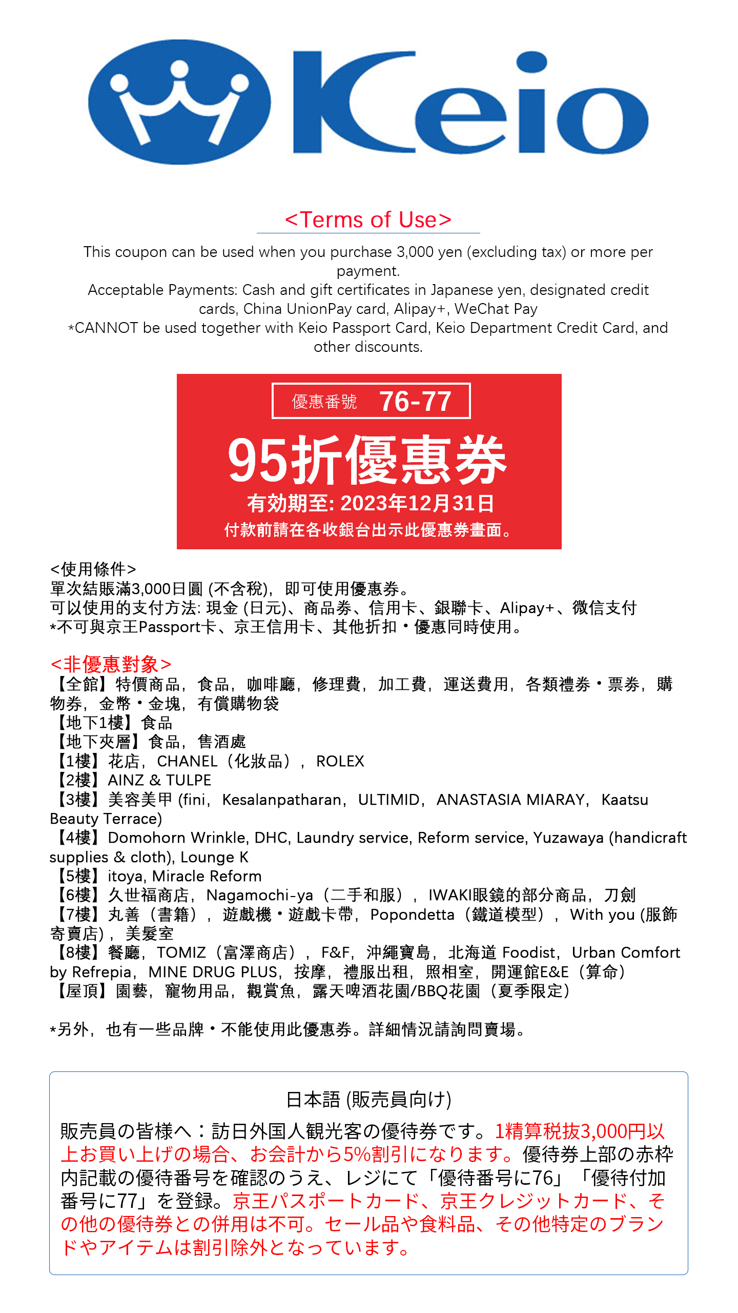 位於東京人流量最多的車站之一新宿站的西口,出站即是交通便利。50年以來,一直受到東京當地居民愛戴的京王百貨店,是一家友好又隨意的百貨店。單次結賬滿3,000日圓 (不含稅),即可使用優惠券。