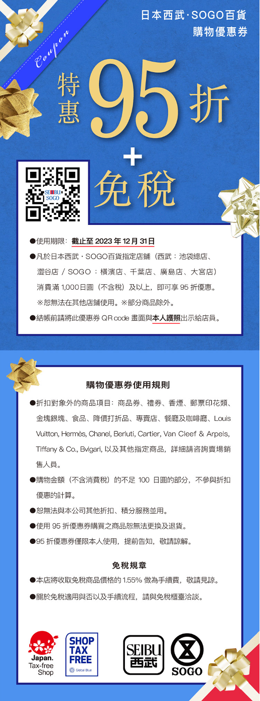 在日本東京熱鬧繁榮的池袋站及澀谷站附近您皆可以發現西武百貨身影,西武百貨是一個全天候可以享受購物元樂的天地,從世界知名的化妝品品牌和奢侈品品牌到獨特的日本時尚品牌都可以選購,滿足您的購物需求。只要在日本西武.崇光百貨指定店鋪,消費買1,000日元(不含稅)及以上,即可享受9.5折購物優惠。