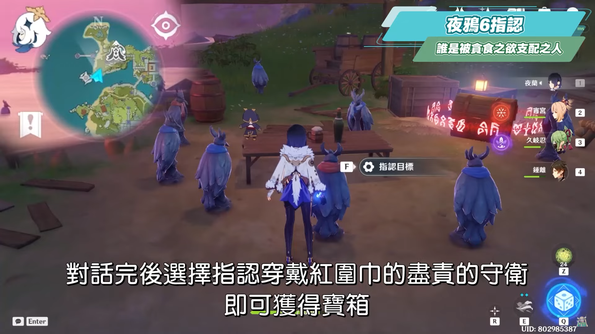 再從上方滑翔飛到島嶼西南方的位置找到一群夜鴉,對話完後選擇指認穿戴紅圍巾的盡責的守衛即可獲得寶箱。