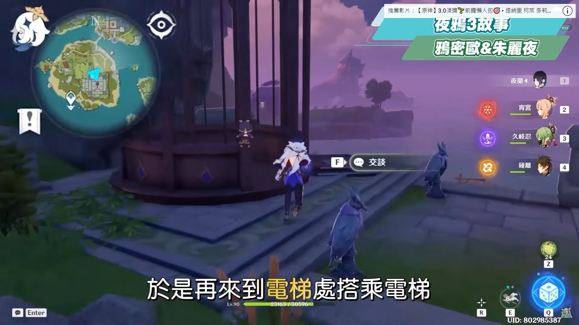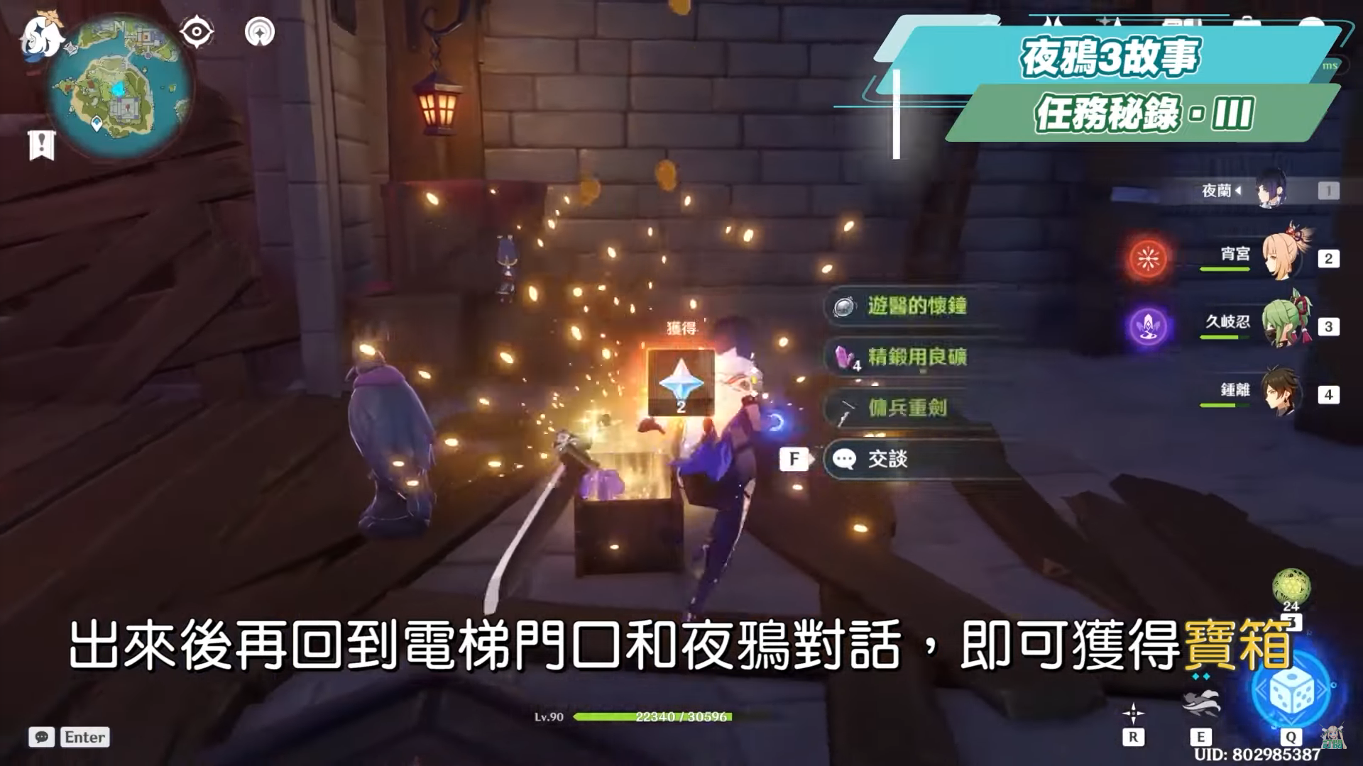 接著從電梯出來找到一個石縫中看到丘丘人,擊敗丘丘人後就可以拿到寶箱,拿完寶箱後面就沒獎勵了,後續劇情對話就可以看要不要再跟鴉密歐對話,回去噴水池也可以再跟朱麗夜了解後續。