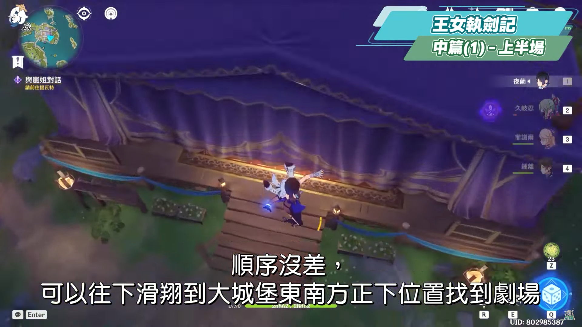 接下來要完成三個中篇的篇章,順序沒差,可以往下滑翔到大城堡東南方正下位置找到劇場