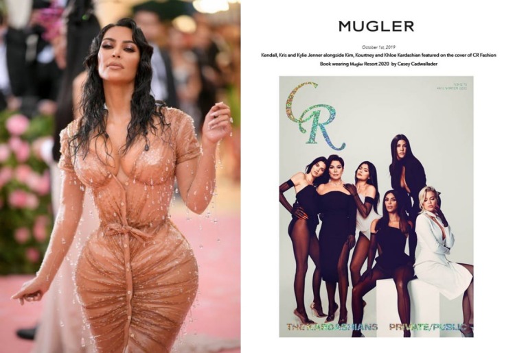 近年來許多品牌都在與名人合作,而帶點前衛風格,又強調身型的 Mugler 該如何在社群媒體上引起關注?我想 2019 年一樣在身型大做文章的話題製造機 Kim Kardashian 幫了品牌很大的一個忙,當年她 Met Gala 的紅毯上身著品牌的「乳膠水滴裝」,她驚人的胸臀比不僅完美演繹了 Mugler 的服裝,其精巧的設計又讓人看見品牌精湛的工藝,同年十月 “Kardashian Family” 一同登上時尚雜誌《CR Fashion Book》,全家都穿上 Casey Cadwallader 筆下的 Mugler,讓成員不同身型的曲線都以極致性感的方式呈現。