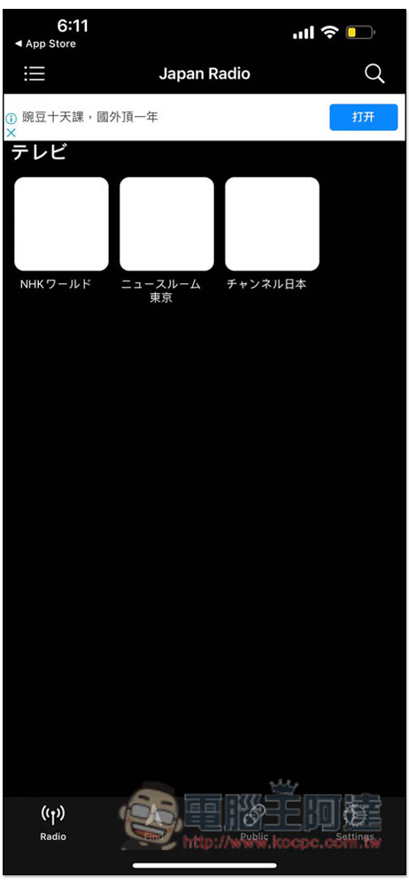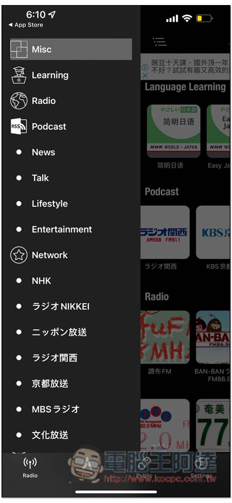 打開左側選單可找到完整分類,下方還有整理一些知名的日本頻道,如:NHK、京都放送、文化放送、MBS 等等,這 App 有中文,看不懂英文不用擔心,進到設定可以調整,等等下面也會告訴你在哪裡:
