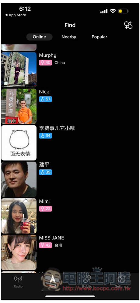 點擊底部的 Find,可以查看目前還有哪些用戶正在線上、附近、以及熱門,男女、各年齡層也都有,這算是我第一次看到日文電台 App 有這種社群功能,對學習來說還蠻有幫助,可以交到一些也正在學習日文、或對日本有興趣的朋友。進到用戶內頁之後,除了可以查看相關資料外,也有加入好友的功能: