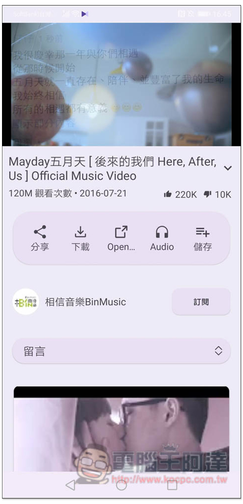 進到播放介面後,如果你是要下載 YouTube 音樂或影片,中間就會看到 "下載" 按鈕: