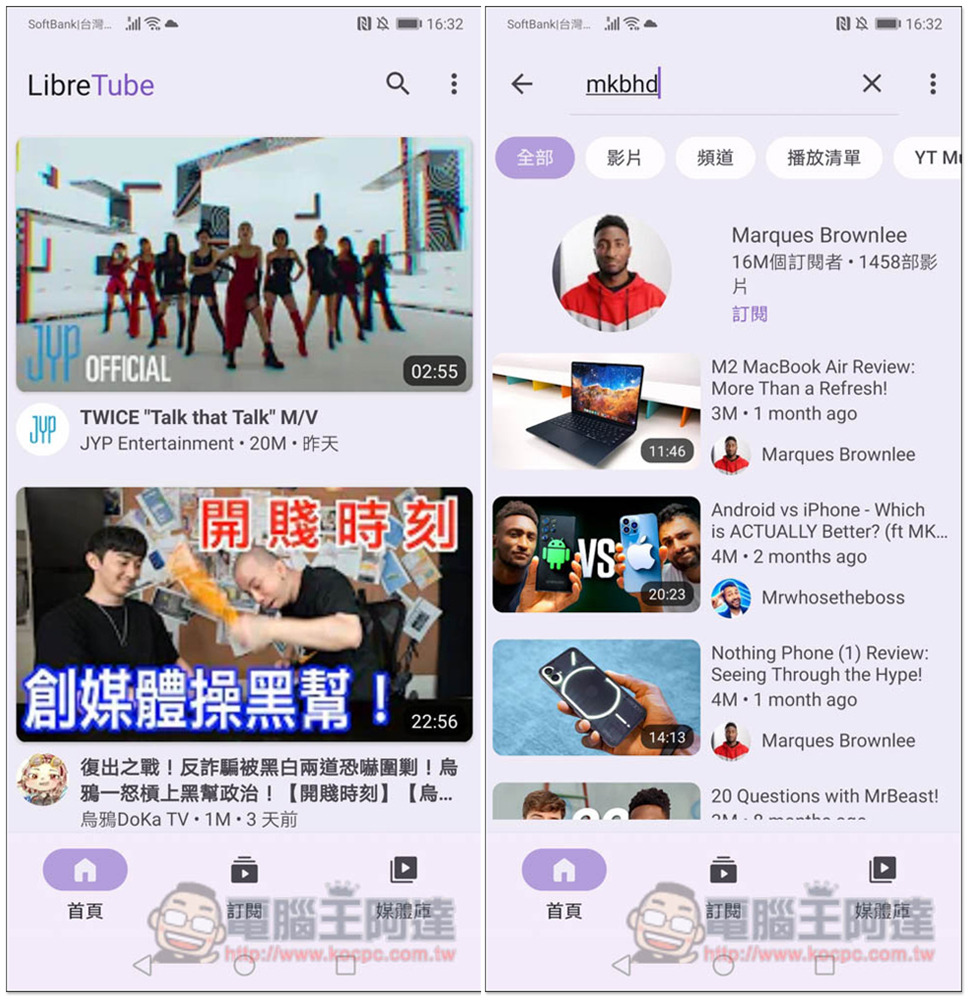 這樣就能開始使用了!介面跟 YouTube 很像,不過完全沒廣告,也能直接搜尋 YouTube 影片、頻道: