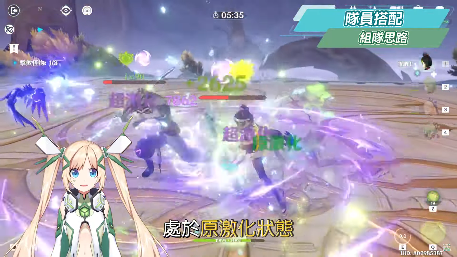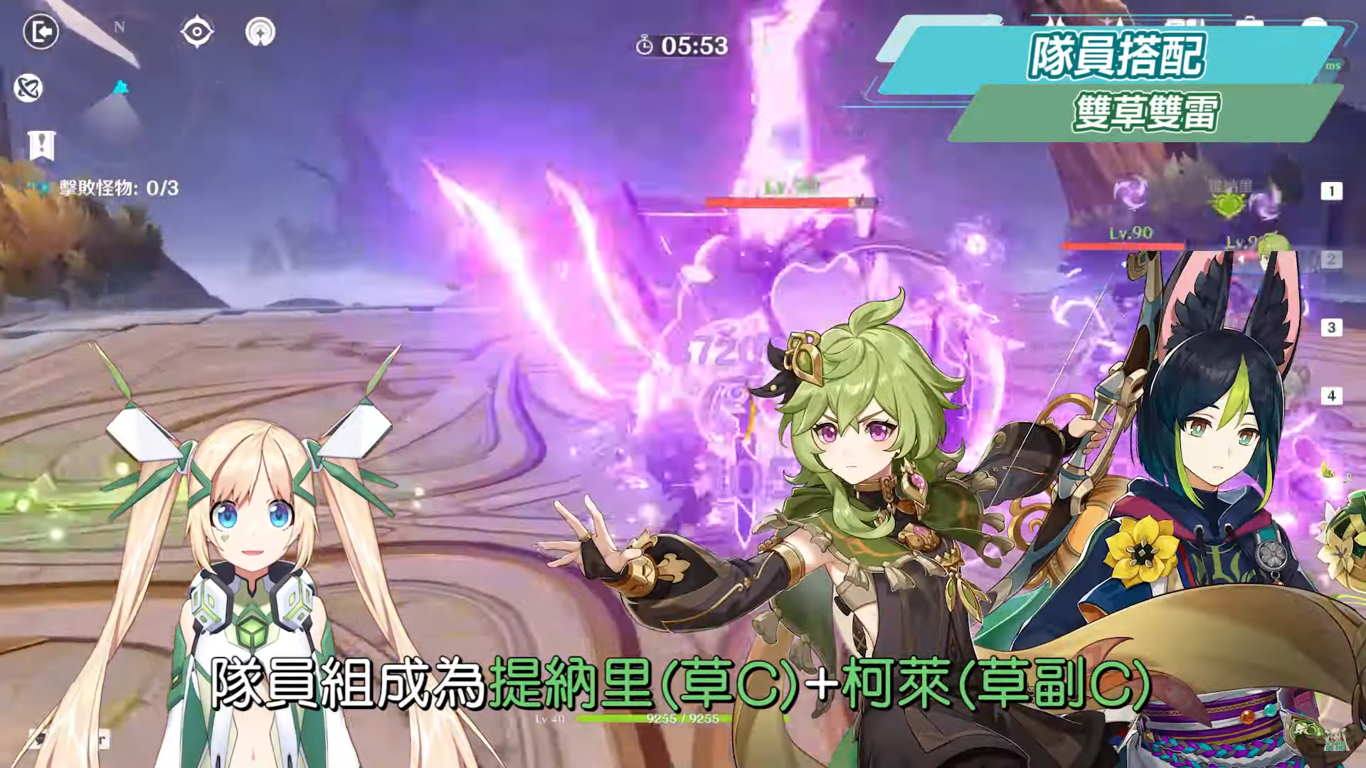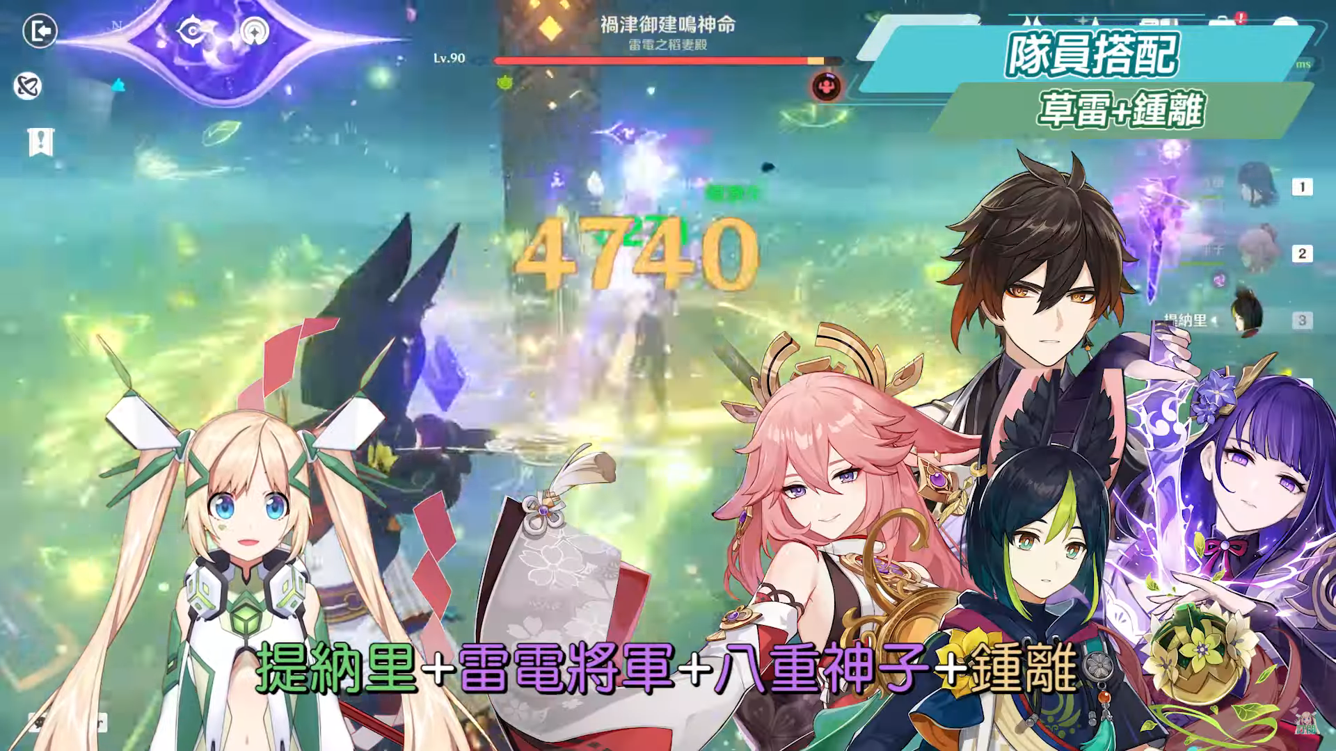 提納里的組隊思路主要從「激化」反應來延伸,也就是說隊伍中一定要至少有一名雷元素角色,剩下可以從組雙草共鳴、雙雷共鳴又或是組上可以提升元素精通、提供護盾、減抗回血的輔助角色等等。輸出上主要透過草+雷打出激化反應,將會有10秒的時間讓怪物處於原激化狀態,而如果是雷草共存狀態下的原激化反應大約可維持5秒,此時再透過後手的雷元素打出超激化反應,又或是後手的草元素打出蔓激化反應,但以目前體驗過草元素相關元素反應的心得來說,洛洛會覺得當前讓草元素作為後台角色、雷元素作為前台角色會更好,理由是雖然草與雷元素同時存在時,雖然不太會互相干涉,甚至有一種共存的狀態,但兩者之間的元素量還是會隨著反應觸發的同時逐漸消耗,而又尤其雷元素會比草元素消耗得更快,所以以草元素先作起手、雷元素後手打超激化反應的效益更好,後續關於草元素相關反應的篇目洛洛也還會再作個別的影片解說。
