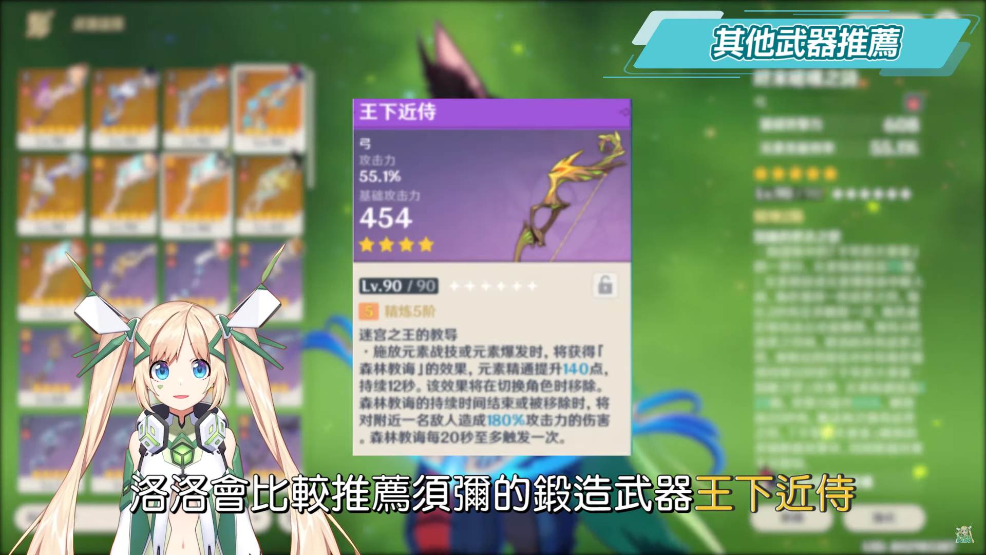 其他武器選擇方面,洛洛會比較推薦須彌的鍛造武器王下近侍,相關的圖紙取得來源需要完成須彌的世界任務「森林書」,後續洛洛會再專門做另外一支懶人包攻略影片,其他可以選擇武器的還有絕弦,除了主屬性提供提納里需要的元素精通之外,E和Q技能的傷害也都會提升,以及同為提供主屬性元素精通的版本活動武器風花之頌,此外主打輸出也可以參考使用鍛造武器試作澹月。