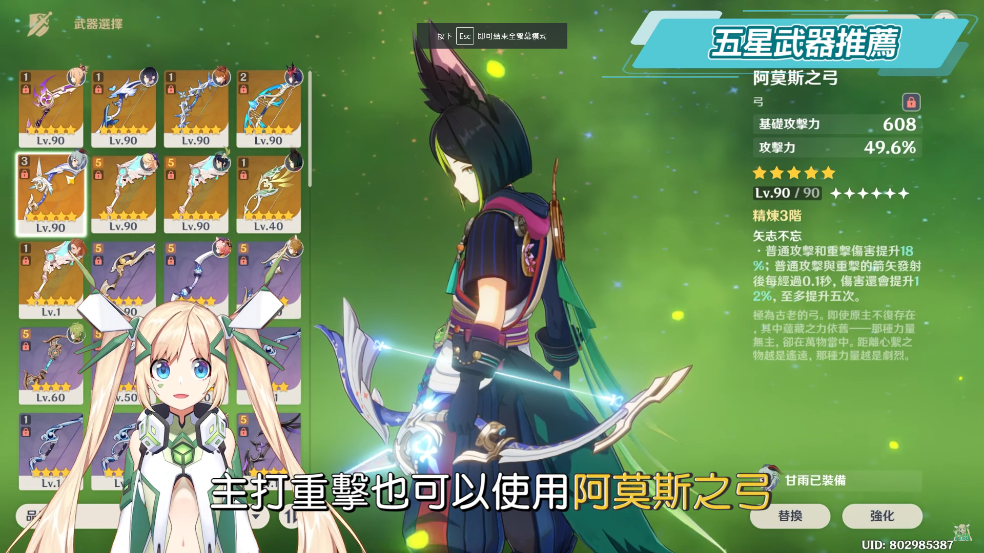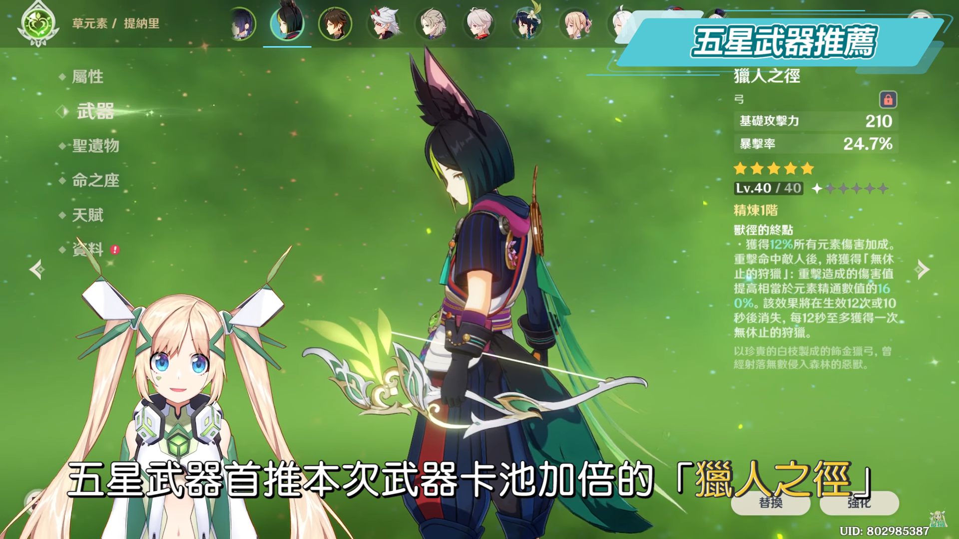 或是紀行武器可以獲得的蒼翠獵弓、彌補需要暴擊率的空間,以及元素爆發傷害增加的曚雲之月等等,而破魔之弓雖然被動也有重擊傷害加成,但是大招要扣著不用,所以洛洛自己是不太推薦,但如果你的提納里主要作為速切的反應工具人定位使用的話,就更多選擇了,像是祭禮弓、西風獵弓,輔助向要求不高只要自己用得順手都可以。