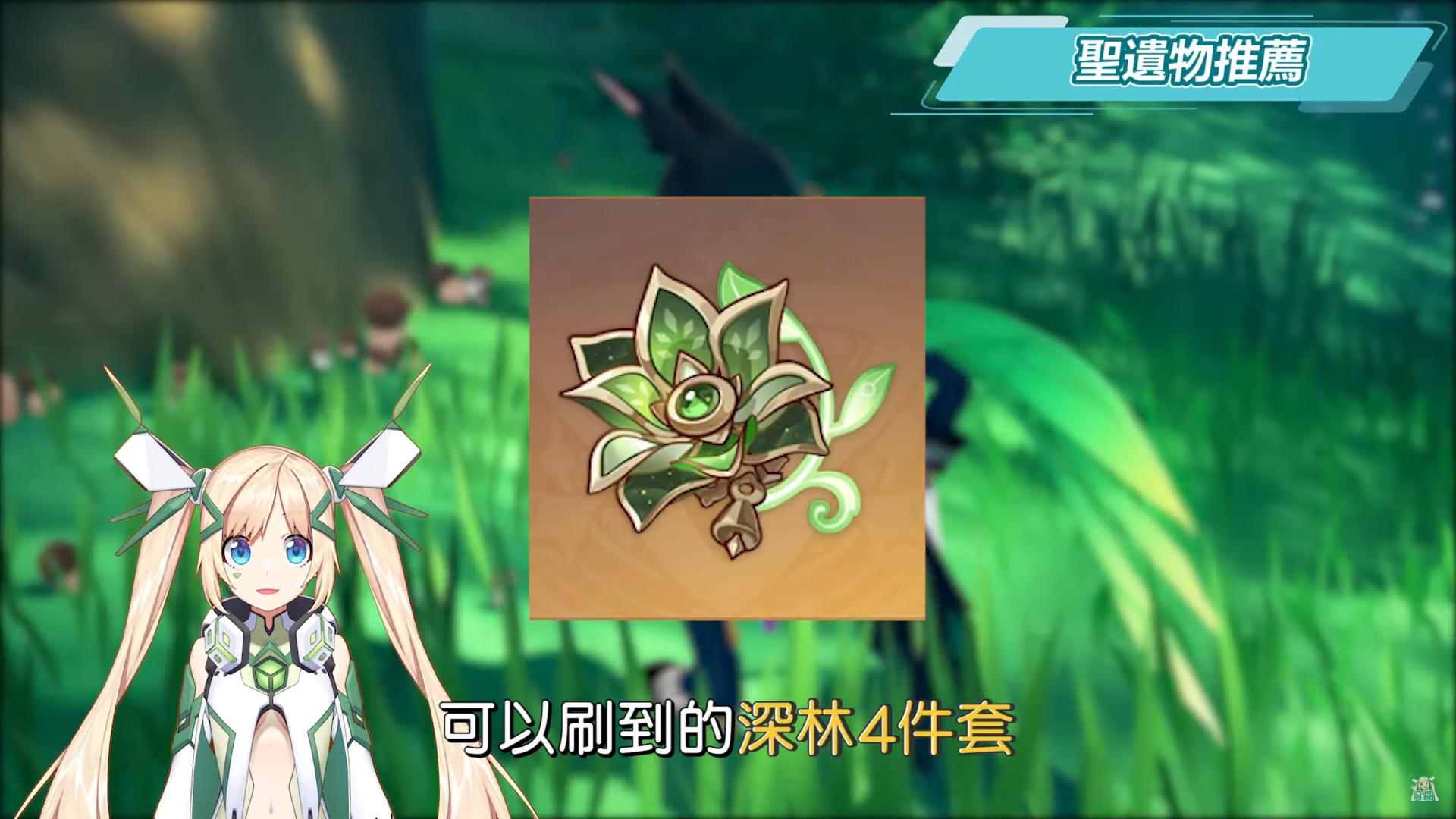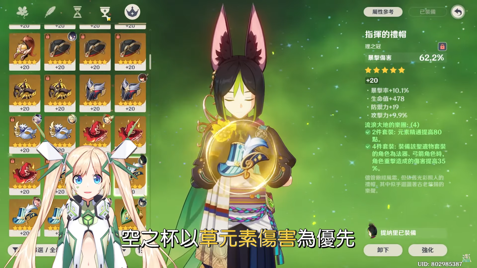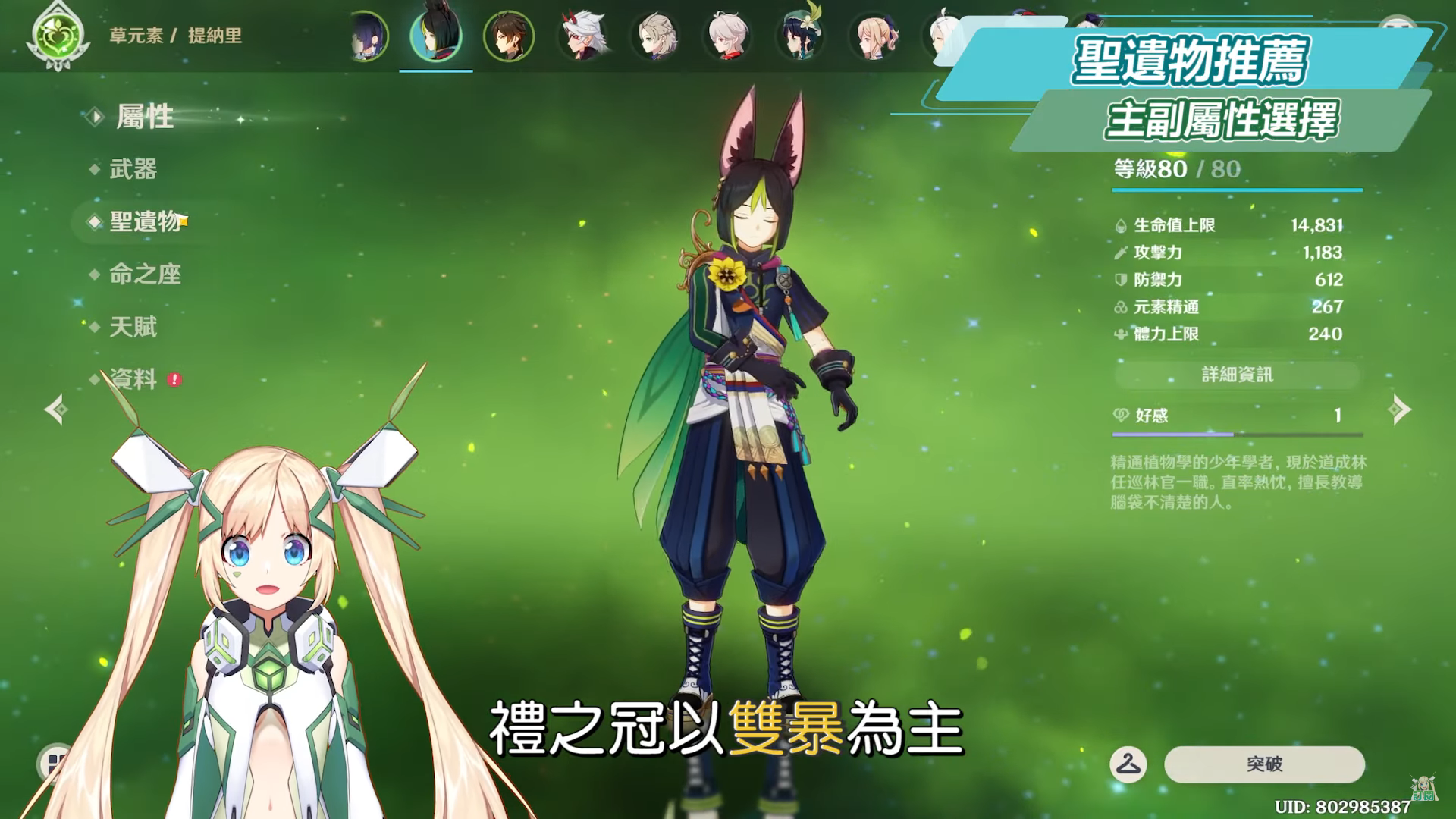 聖遺物主屬性選擇方面,禮之冠以雙暴為主,時之砂以元素精通為優先,沒有的話可以考慮攻擊力%數,空之杯以草元素傷害為優先、其次元素精通>攻擊力%數,副屬性選擇的部分:雙暴>元素精通>攻擊力%數>元素充能效率。