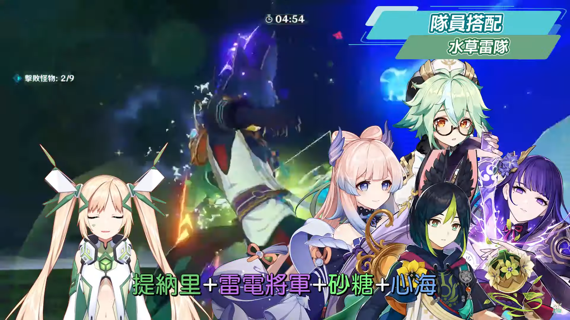 最後就是可以打出激化+綻放反應的水草雷隊,其實在草元素的三種元素相關反應中,洛洛最有感的還是草+雷的激化反應,其次是草+水的綻放反應,最後是比較無感的草+火的相關反應,雖然推薦順序在比較後面,但草+水+雷的激化和綻放反應還算是可以玩的,但是操作上以及元素反應的理解上,屬於需要有一定熟悉程度的玩家才會比較理解,草+水的綻放反應主要是會產生一段時間後會爆炸的草原核,這個草原核在沒有被刺激的情況下爆炸的等待時間有點長,但是若中間搭配有雷元素的刺激,或是高頻的打出超過場上上限的草原核時,草原核就會不斷被引爆,而這種玩法也相對要比較高頻率的去切換自己隊伍中的角色,去觸發水草雷三種元素之間的反應,同時又要注意水、草、雷的元素反應消耗順序,假如敵人身上有水元素附著時,這時就沒有辦法再打出草+雷的超激化或蔓激化,而用草元素攻擊雷水共存的敵人時,雷元素會先消耗,其次才是水元素,所以雷元素消耗完之前會觸發超激化、當雷元素消耗完才會觸發綻放,這邊就有點偏理論的內容了,所以洛洛還是放到後續的影片再說明,總之這邊先示範的陣容為提納里+雷電將軍+砂糖+心海,不過洛洛是覺得水草雷的隊伍或許在後面將推出的須彌角色出來後還有更多玩法,像是妮露、賽諾、艾爾海森等等,因此這個陣容主要先提供給想玩水草雷反應隊伍的玩家嘗嘗鮮。