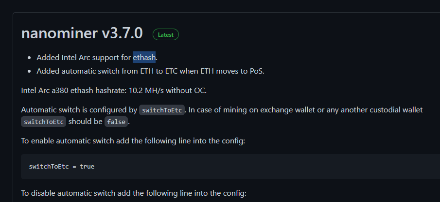 近日 Nanominer 開發團隊宣布加入 Intel ARC 顯卡 ethash 的支援性,另外還有當 ETH 轉過渡至 PoS 權益證明機制後,自動將 ETH 轉至 ETC 的功能: