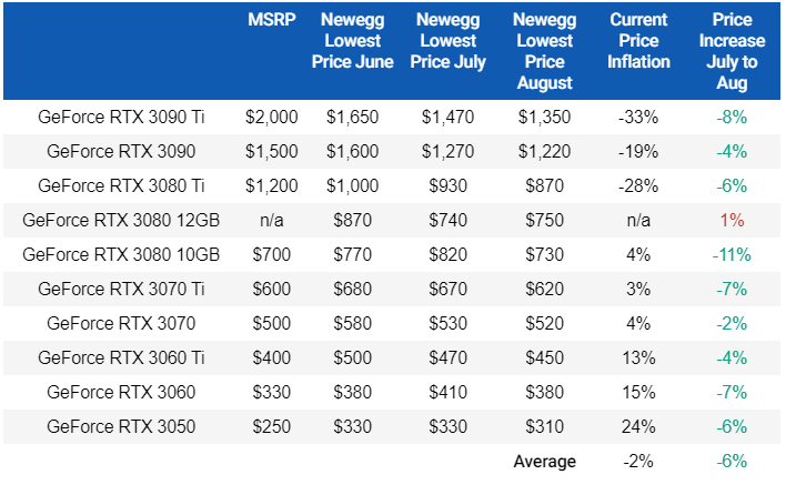 根據 TechSpot 最新統計 GPU 價格追蹤數據,RTX 30 系列部分,高階顯卡都已經比 MSRP 建議售價低很多,像是 RTX 3090 Ti 已經下跌 33%,Newegg 最低可找到 1,350 美金,RTX 3080 Ti 也下跌 28%,最低可用 870 美金入手: