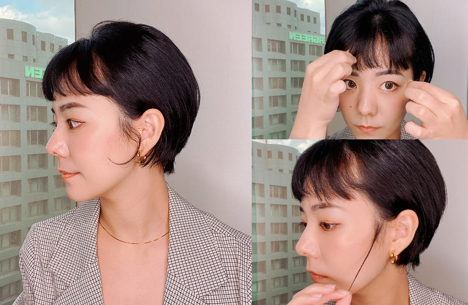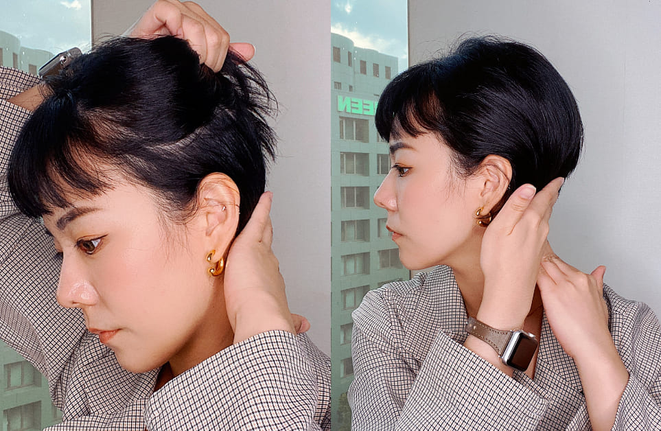 第三步驟,可說是粗硬髮的救星!短髮想要有型、好整理,髮型側邊、髮尾處的服貼度就很重要!髮型師分享,若髮質屬於粗硬髮,容易過於蓬鬆、毛躁,可於濕髮或乾髮狀態時,將頭髮分兩層,同時把手上的髮油輕柔按壓於內側秀髮與髮尾處而後吹乾,就能達到服貼頭型、安撫秀髮的造型效果。
