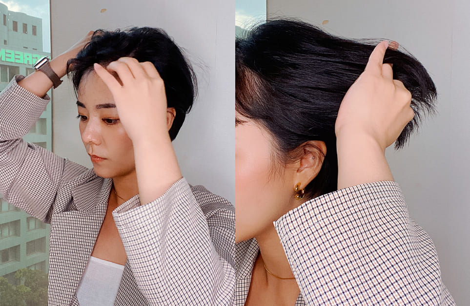 接著,由於短髮最害怕的就是頭型不夠蓬鬆、頭頂扁塌、髮尾不夠貼合,針對以上訴求,想要為髮絲補養卻又兼具造型需求,可以將髮油在手心化開後,以手指當作梳子由髮絲中段溫柔順睏鬆開秀髮,切記不要抹於頭皮,在梳鬆髮絲同時髮由也能均勻沾附於秀髮上。