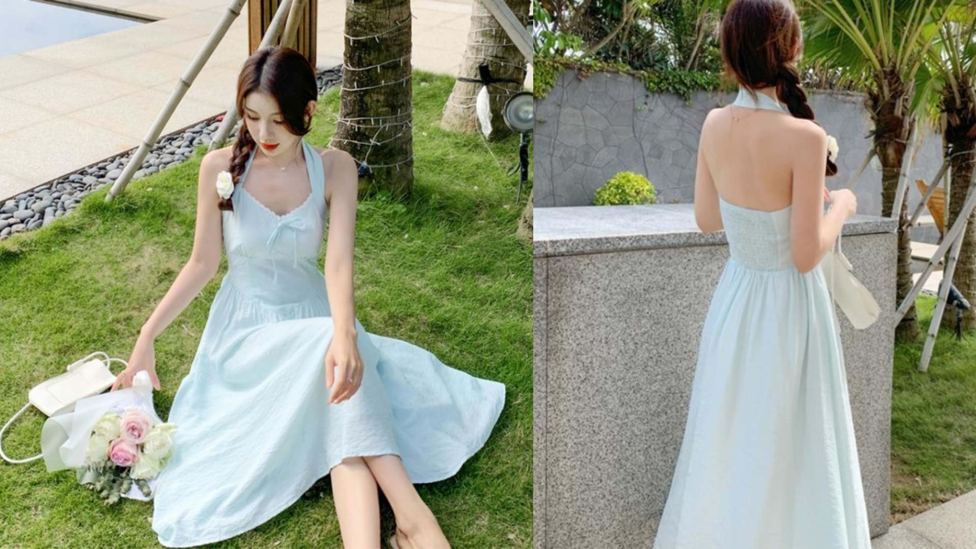 清純的代名詞絕對是寶寶藍!胸前的蕾絲滾邊配上可愛的蝴蝶結,今天最甜美的人一定是你~後腰使用了鬆緊腰,大部分的身形都能穿,就算午餐吃太飽也不用怕!而繞脖的設計能修飾肩膀,讓手臂看起來更纖細修長,髮型隨便綁個辮子就非常好看,喜歡軟萌風格的姐妹必備!