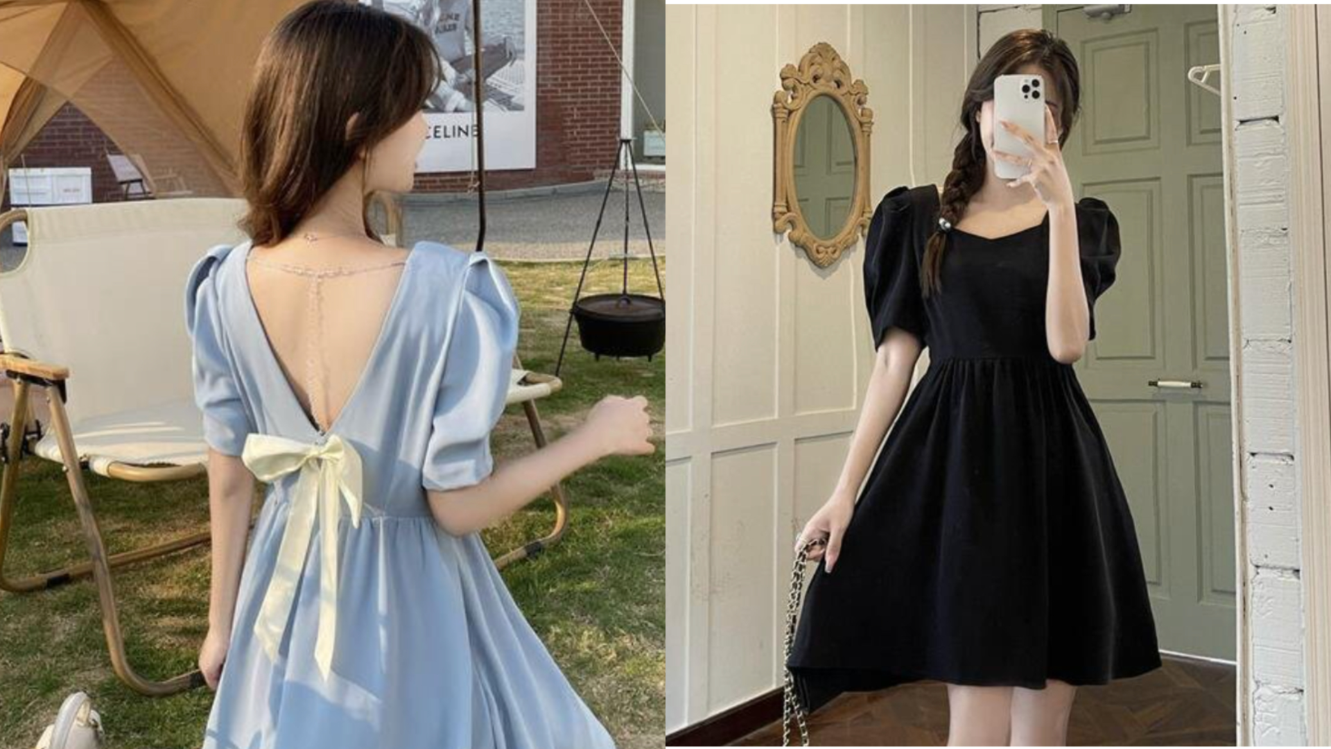 氣質小姊姊在哪邊~喜歡法式優雅風格的一定會愛上這件!後背的V領能拉長上半身的比例,奶油色的蝴蝶結裝飾更增添俏皮感,而澎袖和桃心領的設計營造出微微復古宮廷風,洋裝背面還有鏈條作點綴,想當個小公主選這件準沒錯!