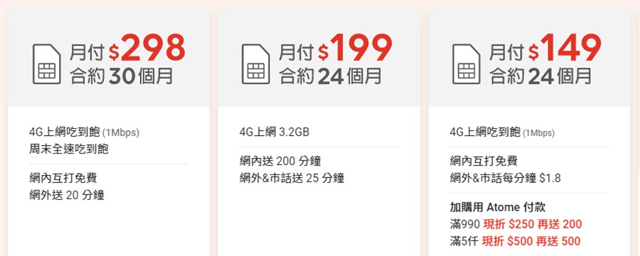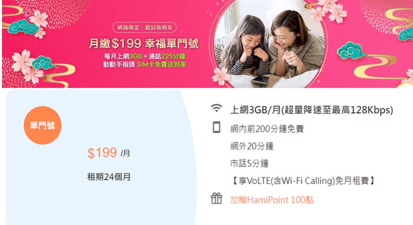 若需使用較多免費數據量則可以選擇新朋友限定的「$199幸福單門號」,每月可享3GB免費上網量,網內前 200 分鐘免費、網外 20 分鐘、市話 5 分鐘。