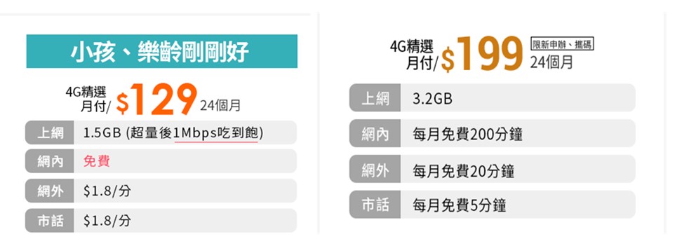 在優惠方案部分,目前有針對小孩及樂齡推出「 4G 129(24)單門號方案」,小資族則有199(24)單門號方案。