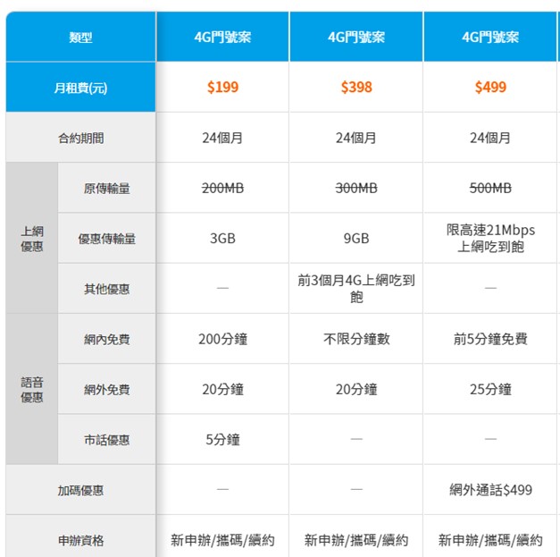 台灣大哥大目前月租費牌價最低的資費是4G 199 單門號(24),每月免費3GB上網量,網內語音免費200分鐘、網外語音免費20分鐘、市話5分鐘。