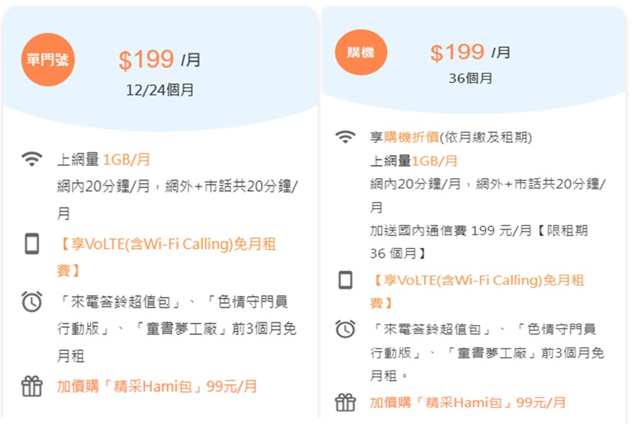 中華電信目前月租費牌價最低的資費是4G 199 單門號(12/24)及4G 199購機案(36) ,每月可享1GB免費上網量,網內20 分鐘免費、網外+市話免費 20 分鐘。