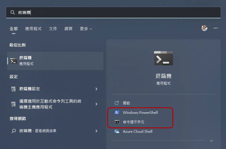 - 搜尋「終端機」後,你可以看到有兩個不同選項,分別是「Windows PowerShell」與「命令提示字元」兩種,接下來我會把兩直種不同途徑的做法告訴你。