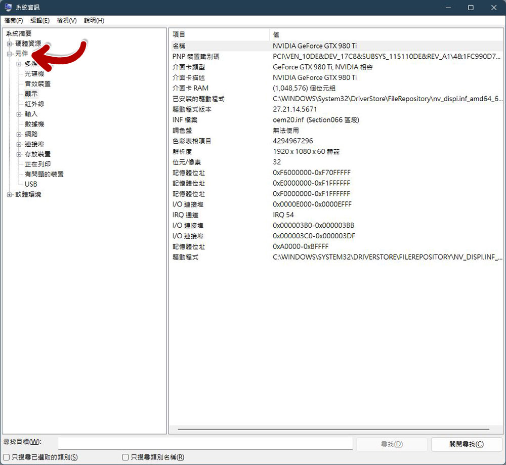 - 如果你想要了解關於電腦其他硬體的詳細內容,請展開側邊欄的「元件」選單,在這裡你可以看到有關顯示器(包含GPU顯卡)、音訊設備、儲存等地資料。其中的一些子目錄也可以展開,因此你可以看到非常完整的內容。