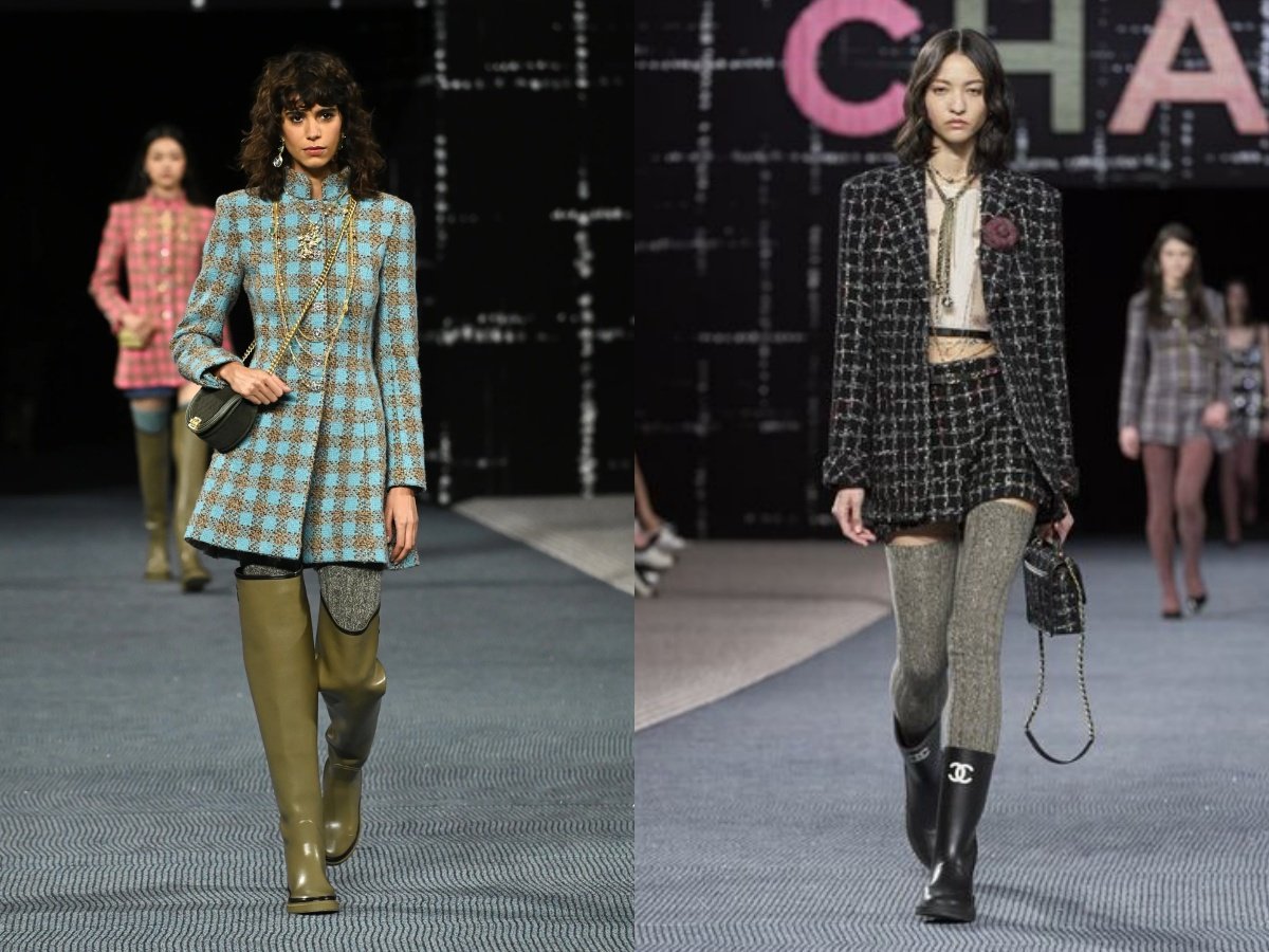 在今年3月份登場的CHANEL 2022秋冬大秀上,將香奈兒女士與西敏公爵曾經造訪的蘇格蘭邊境地區的特威德河(River Tweed)河岸景緻作為秋冬系列的應感來源,打造一系列服裝、配件與鞋款設計,而這雙雨靴也出自創意總監Virginie Viard之手,將雨靴再度變成時尚穿搭中的點睛單品。