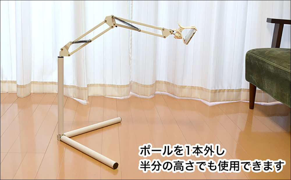 高度方面, Thanko 這款手機平板支架可調整支撐高度,支架本體最高 70 公分,加上前端的懸臂最高能調整到約 122 公分的高度。這高度即便擺放在地上,也能輕鬆拍攝桌面上的物品。