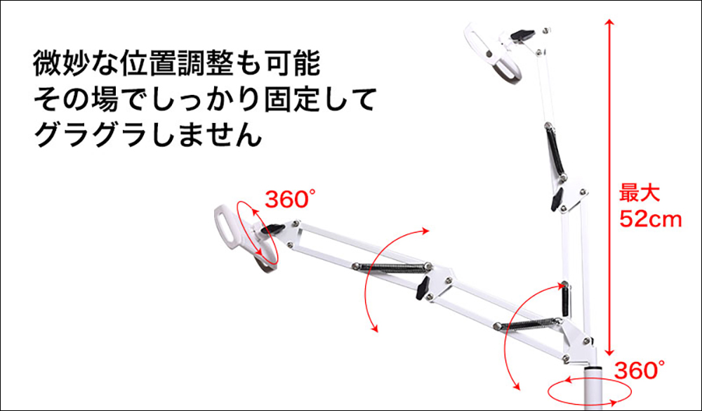 支架的能 360° 調整懸臂角度,懸臂更提供有多段的高度、角度調整,同時在夾具配備了 360° 萬向頭,讓拍攝過程要微調也更容易。