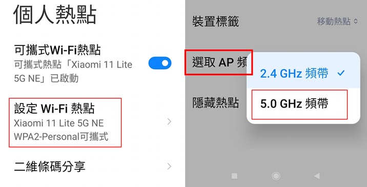 若是使用手機當個人熱點(無線分享器),由於現在的手機(尤其是5G手機)大都支援【雙頻WiFi】功能,可以連結2.4GHz頻段”或是”5GHz頻段,所以只要將手機WiFi熱點的AP頻段設成5GHz,通常就可以解決WiFi卡卡的困擾!