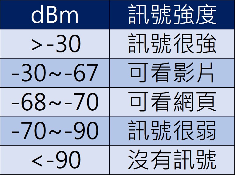 WiFi的訊號強弱通常用dBm來表示, dBm是一個計數單位,表示功率絕對值的值,數值越大信號就越好。若要觀看影片,dBm> -67,若訊號強度不佳,就要調整WiFi分享器的位置或是避開干擾。