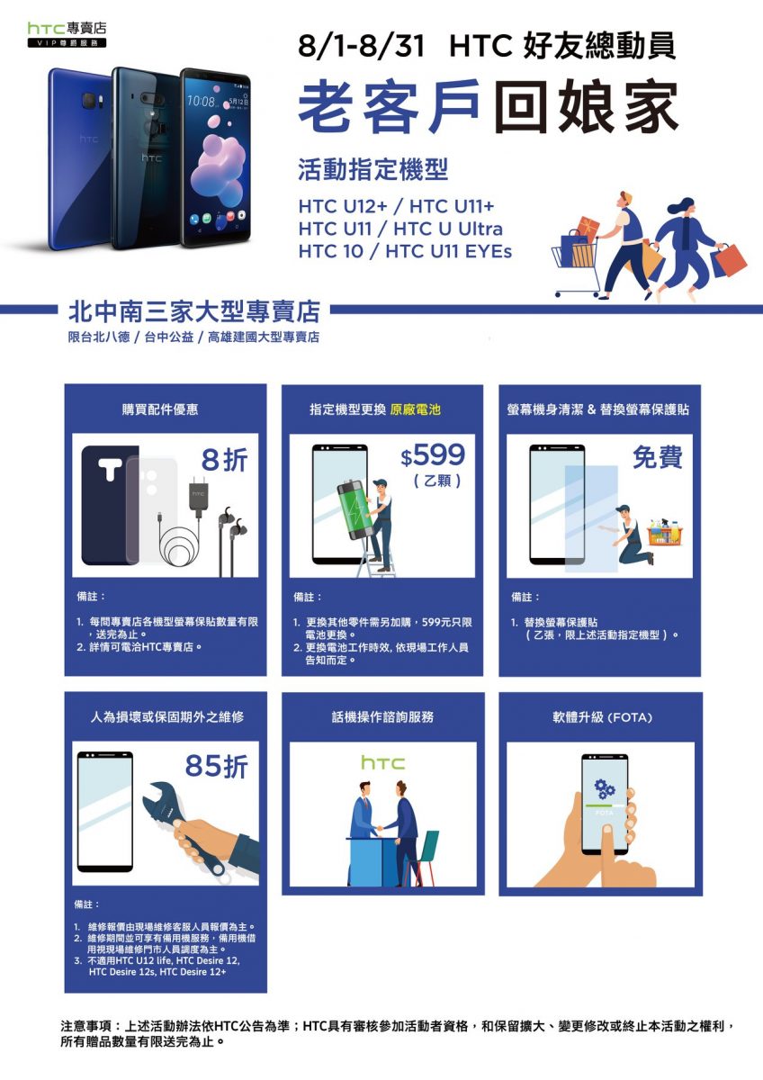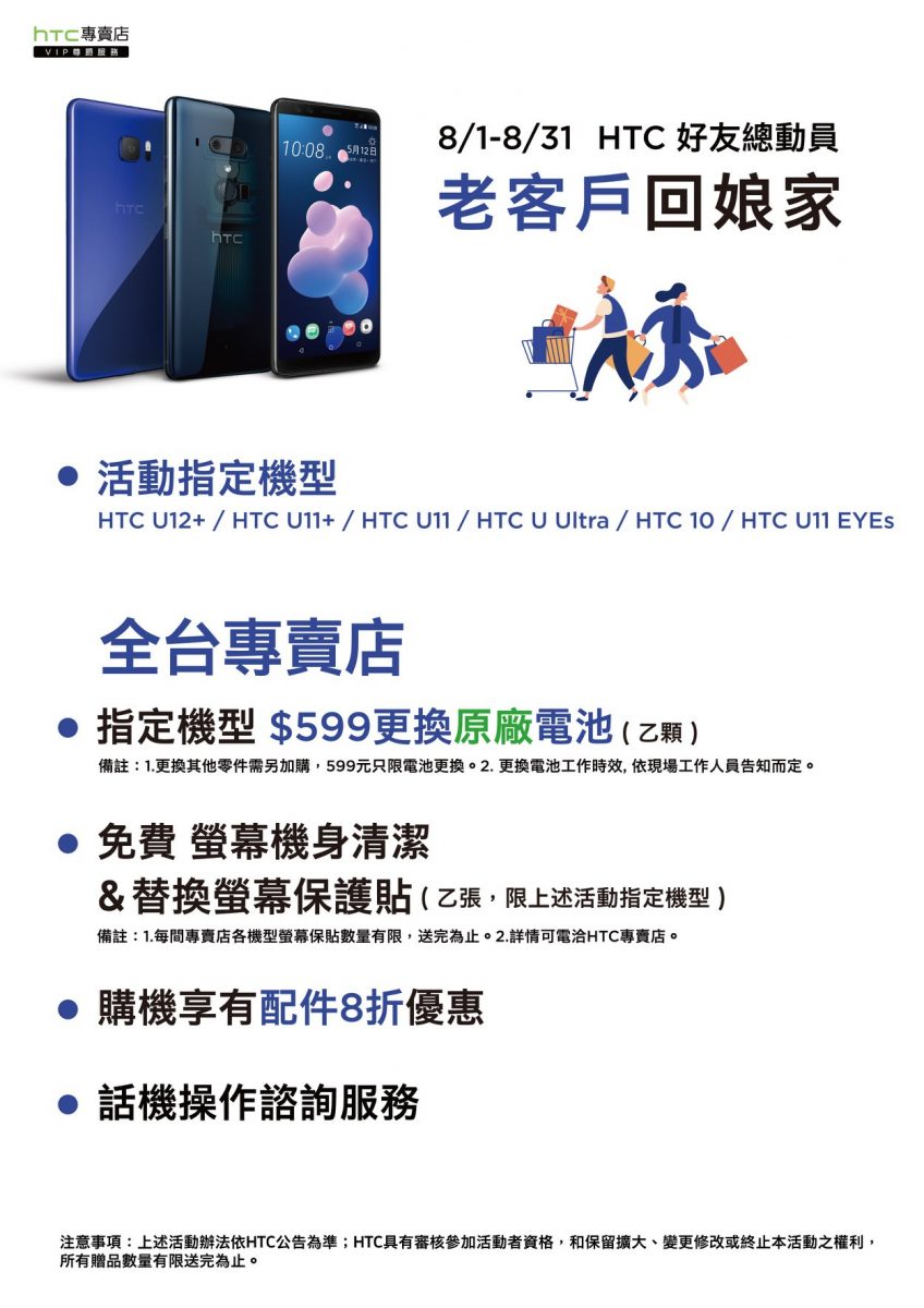 HTC 官方粉絲團於稍早推出最新活動訊息。為了迎接過去幾年購買 HTC手機 的老客戶,將於今日8/1日到8/31日舉行老客戶回娘家的優惠活動。優惠內容包含『 新台幣599元更換原廠電池 』、『免費清潔螢幕 』、『 更換螢幕保護貼 』等。如果有Android 9.0升級 等問題,也可現場詢問工程師做系統升級服務。