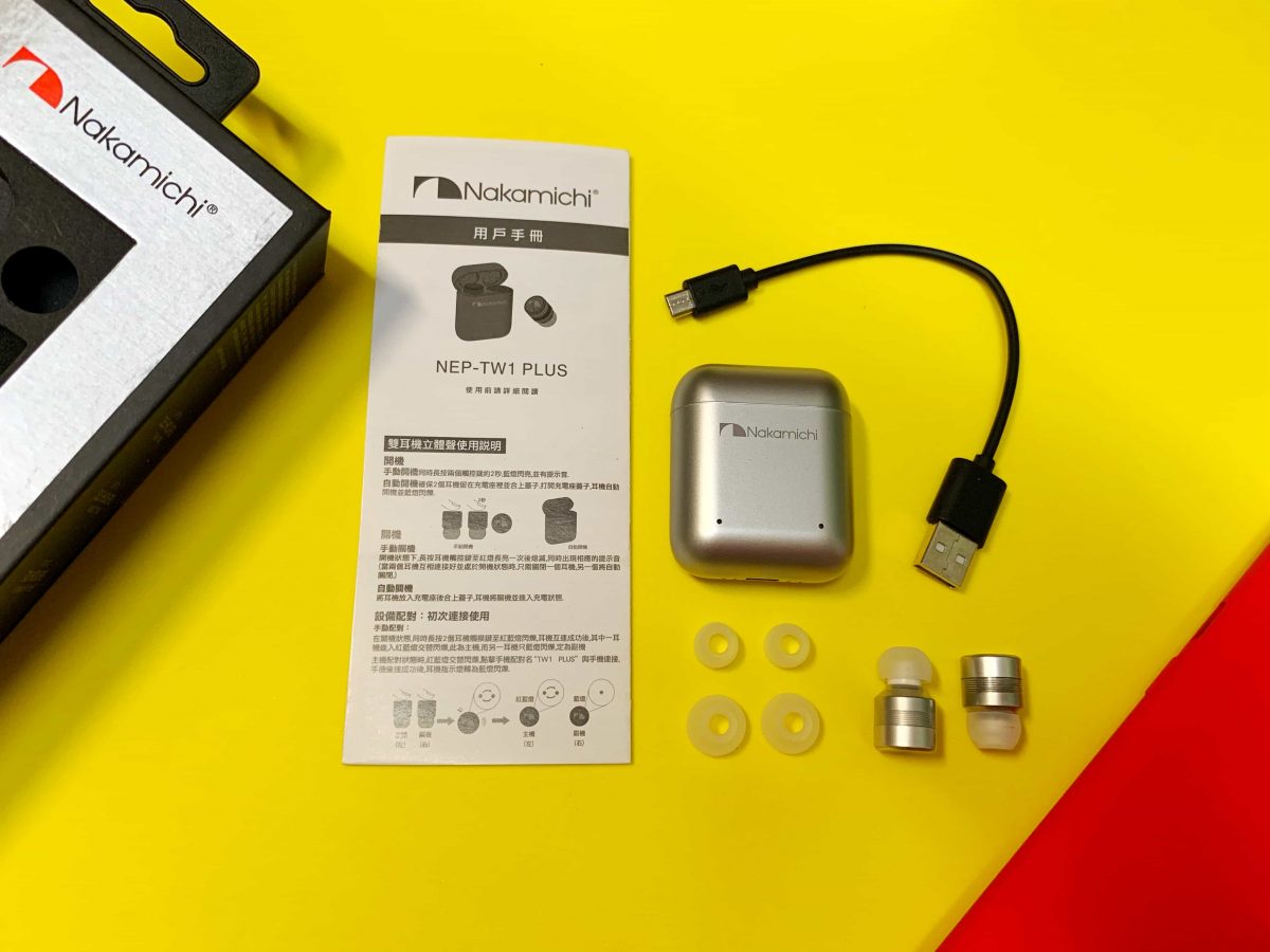Nakamichi NEP TW1-Plus 外包裝設計得非常有質感,從包裝正面上的日文字即可得知這款耳機是在日本中道公司的 真無線藍牙耳機。打開包裝後可以看到耳機本體與充電艙被海棉包覆住,下方則是隨盒裝附贈的配件。主要含有: