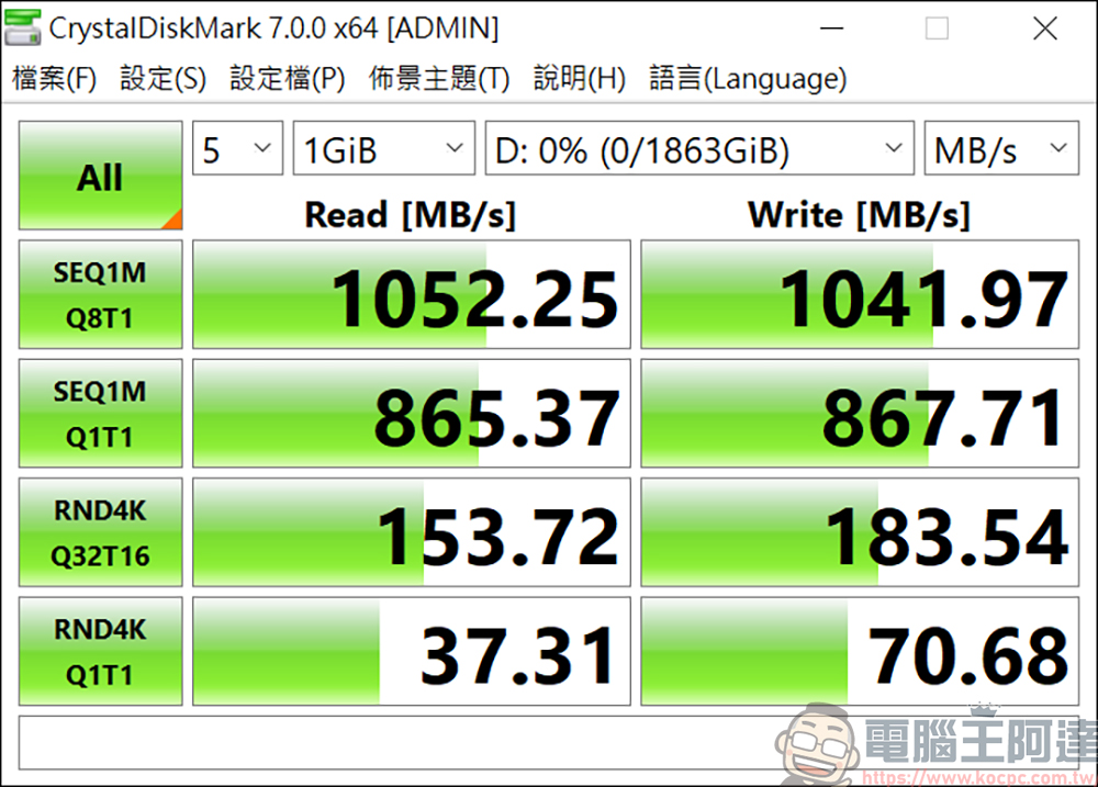 使用 CrystalDiskMarkPortable 進行讀寫測速,結果如下,確實有達到 10Gbps 的高速讀寫: