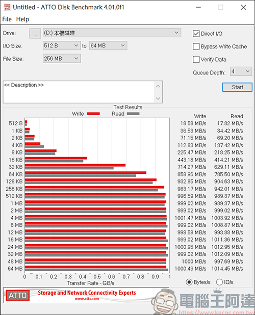 使用 ATTO Disk Benchmark 進行讀寫測速,也是差不多的結果,都擁有 10Gbps 的高速讀寫: