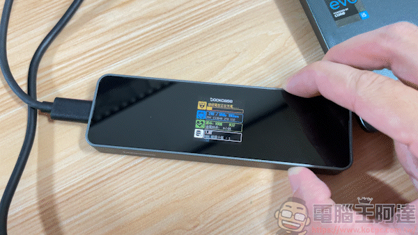 DPR71S 最高支援 PD 100W 快充,採用 7112 PD 晶片,具有 24V CC 耐高壓保護,不讓高壓電流燒壞主機板,具有保護主機的作用。插上的同時,DPR71S 的螢幕上也會顯示目前輸出來源的功率,好讓使用者掌握自己接上的電是否有符合裝置的需求: