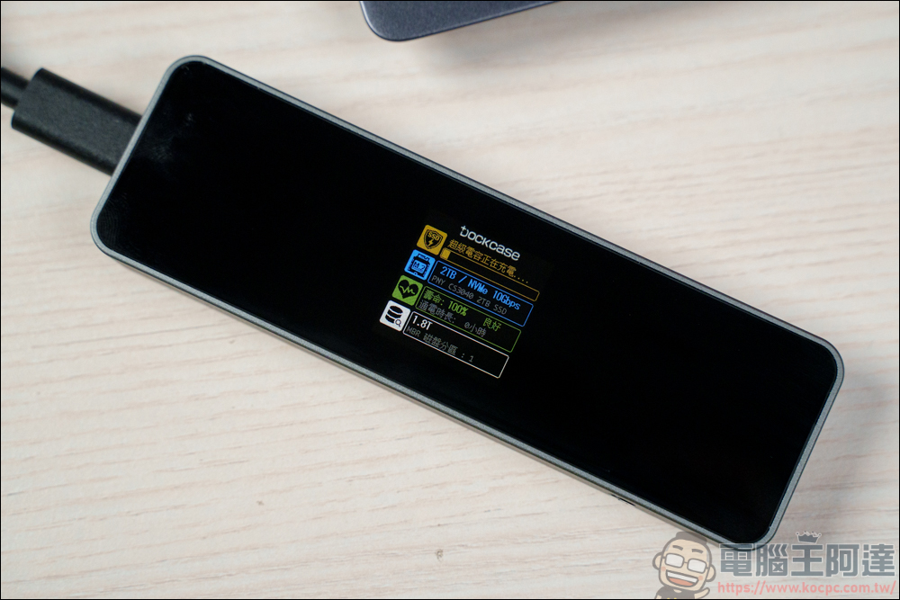 由上而下可以得知目前 DSWC1P-10 電容的電量、裝入的 SSD 資訊、SSD 壽命、SSD 容量,都可以透過這塊顯示螢幕一目了然。其中兩項 SSD 壽命、SSD 容量是非常實用的功能,你可以隨時知道裏頭該顆 SSD 的狀態,容量不夠或是快掛了都能隨時掌握: